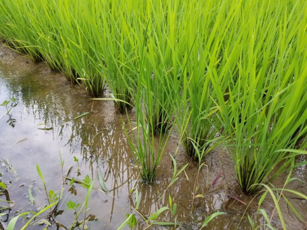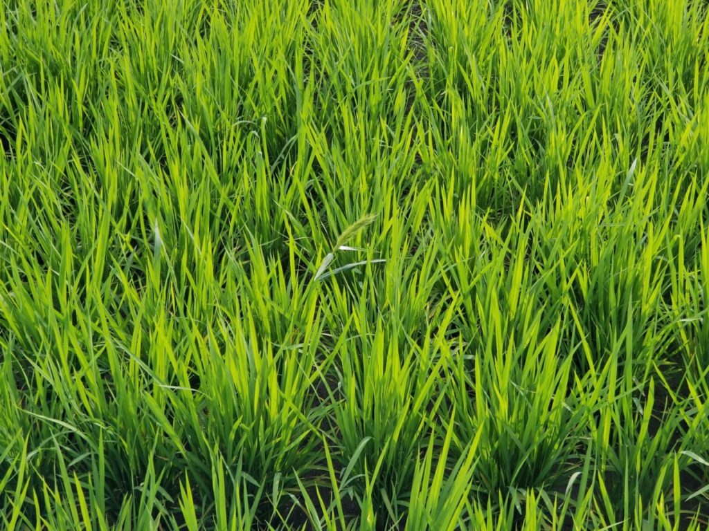 慣行栽培の田んぼは除草剤を散布しているのですが、今年も除去しきれなかった雑草がちらほらと見えてきています。