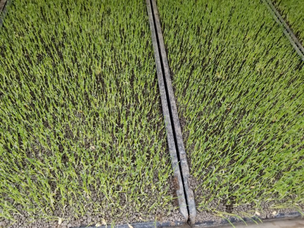 育苗機から苗を出してから2日もすると、苗は緑色になってきます。