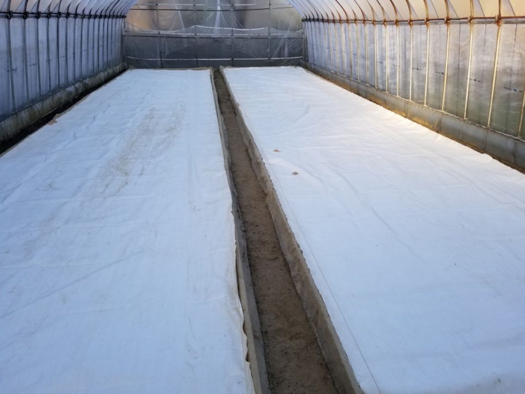 育苗機から出してすぐの苗は、今まで光が当たらない環境にいたのでいきなり光が当たると苗やけを起こしてしまうのでそれを防ぐために白色のシートをかけておきます。