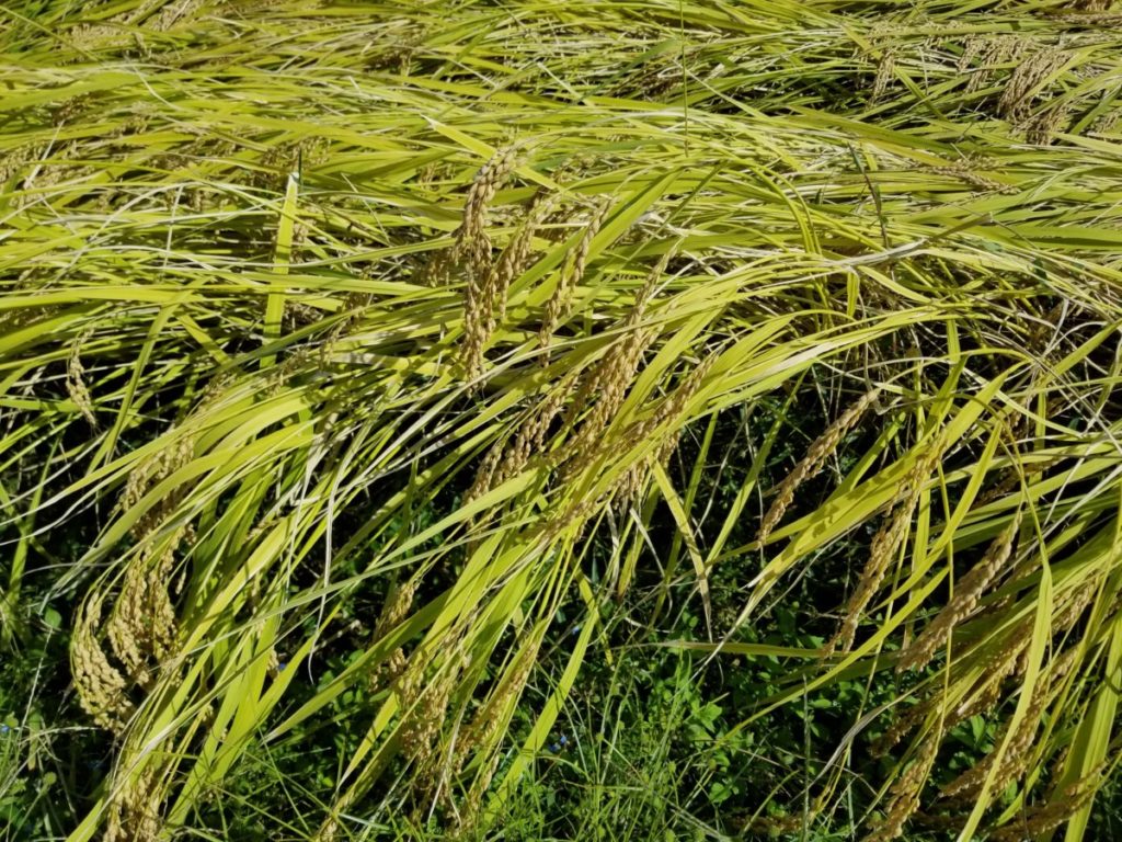 週末に台風の影響で雨が降ったものの、大きくつぶれることもなく無事に刈り取りを迎えられそうです。