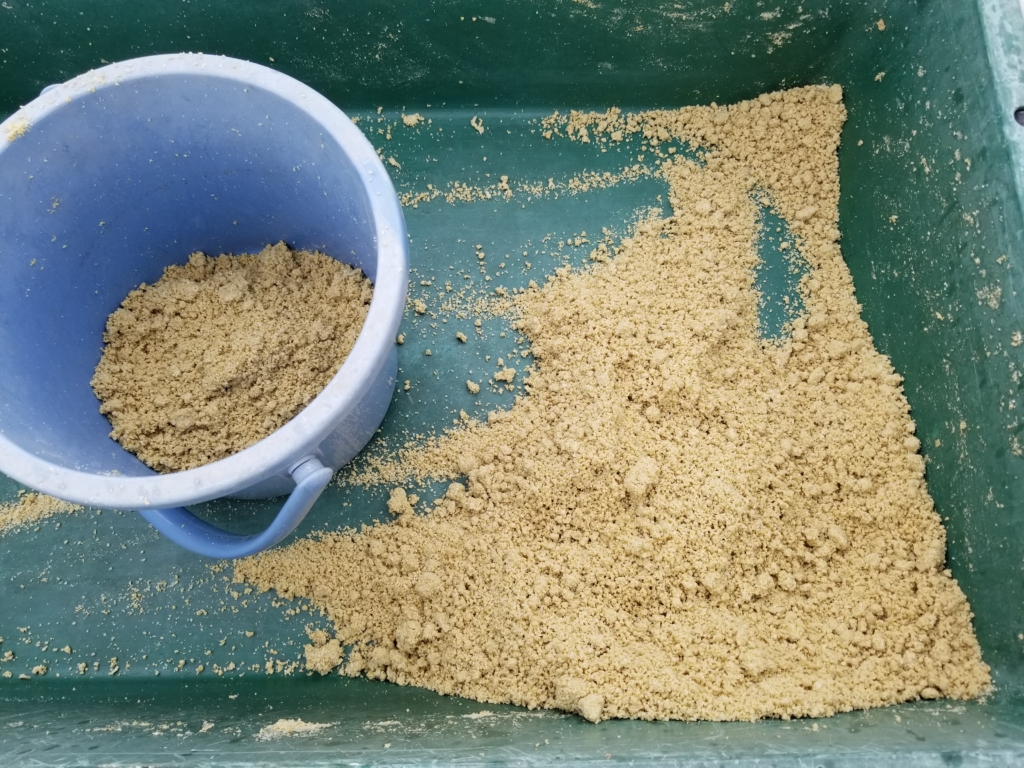 米ぬかはそのまま散布すると水に浮いてしまうので、容器に米ぬかを入れそこに水を加えて混ぜ、そぼろ状にしてから散布しました。
