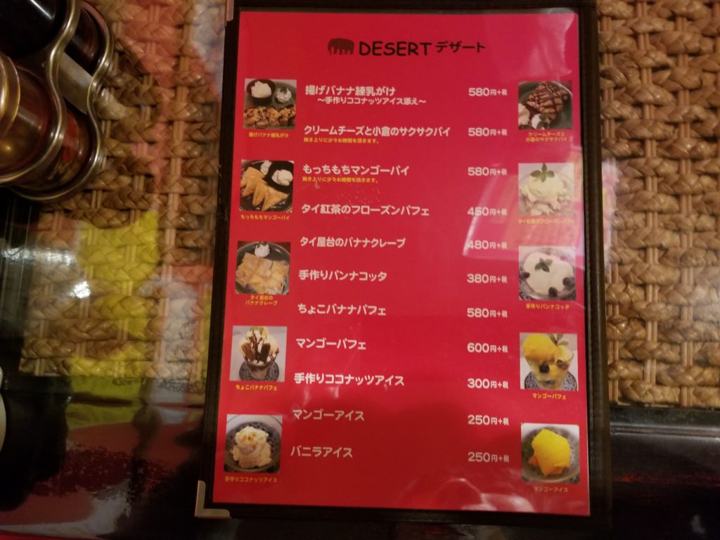 揚げバナナやマンゴーパイ、タイ屋台のバナナクレープなどタイっぽいデザートが多数あります。