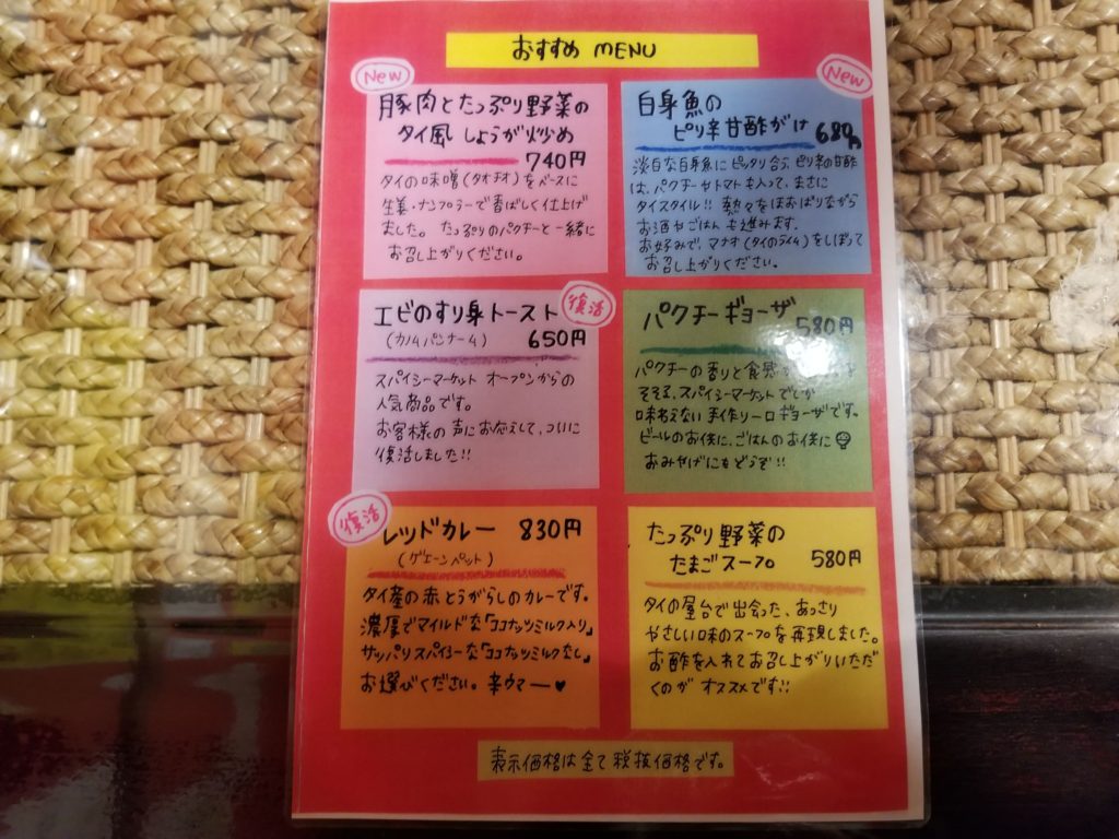 こちらは今回行ったときにおすすめされていたメニューです。